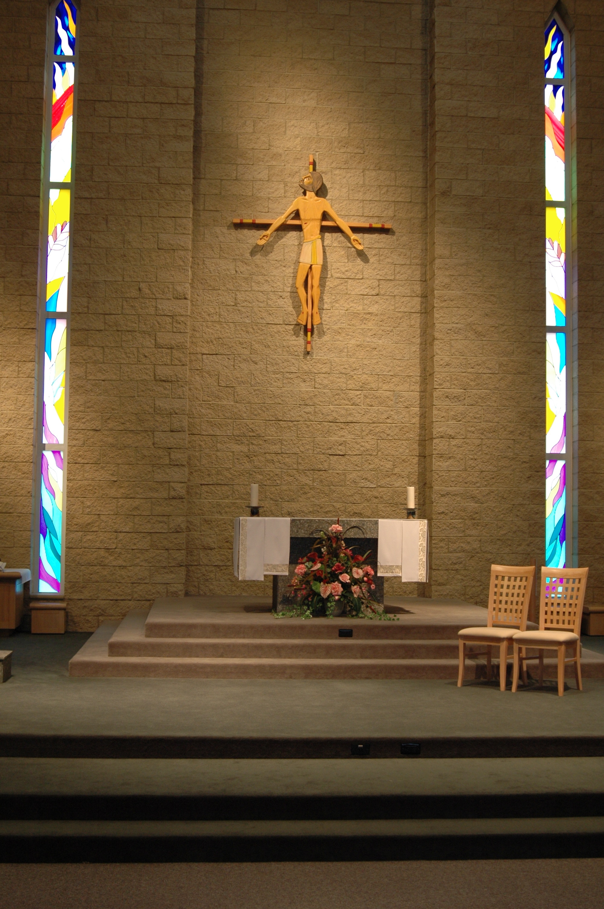 Our processional cross was made by the people of Tecomate Cooperative in La Palma, El Salvador. The Spanish phrase la nueva creacion announces “the new creation” that results from Jesus’ death and resurrection. The sun reminds us of the risen Jesus. The mountains’ colours evoke different kinds of vegetation. Plants, animals and birds proclaim that all of creation is renewed in the cross of Christ. Around Jesus’ feet is a circle of houses. Just below, a bird in a tongue of fire rests on the heads of a group of women (most of the cooperative members are women), both reminders that Christ pours His Spirit on all people from the cross and draws them into community.